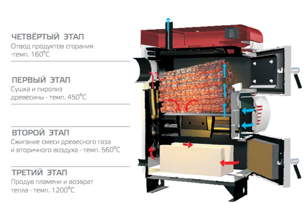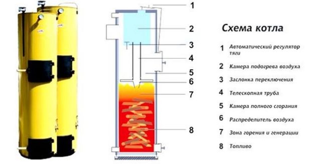 Les chaudières à pyrolyse (génératrices de gaz) sont disposées un peu plus compliquées. Présent dans leur conception deux chambres de combustion. Dans le premier combustible solide mis (bois de chauffage), à haute température et une carence en oxygène se produit processus de pyrolyse avec libération de gaz de pyrolyse. Il entre dans la deuxième chambre, où il brûle et dégage de la chaleur vers le caloporteur. Il ne reste que du charbon de bois.
