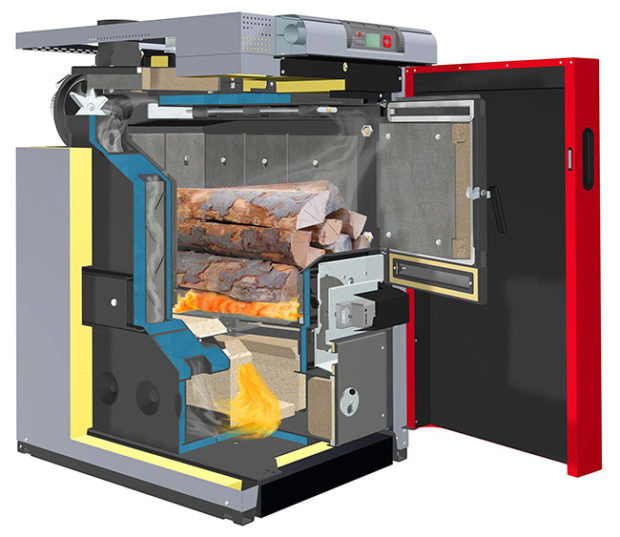 Ce type de chaudière rappelle largement la pyrolyse, mais diffère par certaines caractéristiques techniques. Les brûleurs à combustible solide dans la première chambre forment des gaz qui brûlent dans le deuxième four. Dans ce cas, seule la partie supérieure du combustible est impliquée dans le processus de combustion lente et de combustion. Pour cette raison, il est nécessaire de le charger moins souvent et l'efficacité augmente. Une charge de bois de chauffage suffit pour que la chaudière fonctionne deux jours. Le principal inconvénient est le coût élevé de l'équipement.