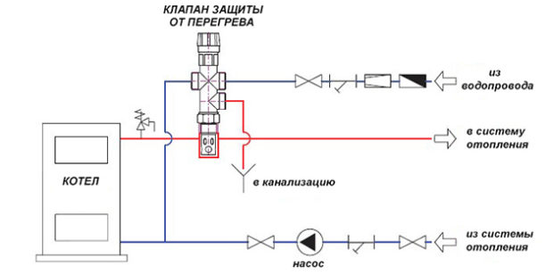- la deuxième option prévoit robinet d'arrêt. Si la température de l'eau atteint des valeurs critiques, la vanne l'empêche de pénétrer dans les tuyaux. L'eau froide du système d'alimentation en eau est fournie au système d'alimentation en chaleur et le liquide de refroidissement surchauffé est vidangé dans égout. Certes, la pression de l'eau doit être suffisante et sa composition ne doit pas être haute teneur en selqui provoquent la formation d'échelle.