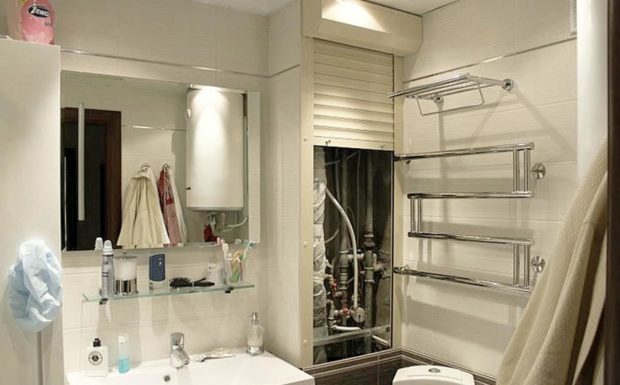 - avantage supplémentaire - la possibilité d'organiser derrière les volets roulants système de stockagesi, bien entendu, la nature de l'emplacement des communications le permet. Les articles les plus disgracieux, mais très nécessaires peuvent être cachés loin des yeux, et s'ils sont nécessaires, vous pouvez les obtenir en quelques secondes;