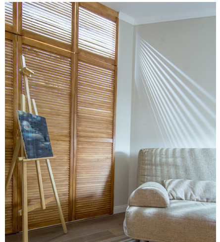 Parfois, des idées naissent lorsque vous ne les attendez pas du tout. Par exemple, au lieu des portes d'une armoire classique, vous pouvez utiliser des volets (construction à cadre avec de nombreux panneaux horizontaux et un petit espace entre eux), et grâce à la bande LED qui se cache derrière les portes, il semble que la lumière du soleil tombe dans la pièce à travers la fenêtre avec des volets. L'effet est si fort que même votre cerveau, qui connaît le secret de la pièce, percevra le flux de lumière artificielle comme des rayons naturels.