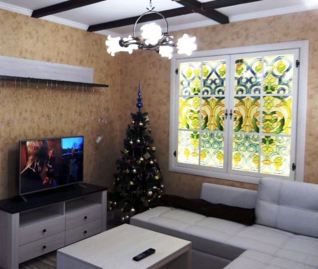 - fenêtre rétro-éclairée il permet de simuler une vraie fenêtre aussi naturellement que possible, mais une petite niche (7-10 cm de profondeur) est nécessaire pour monter une telle structure dans le mur. Il est monté réfléchissant feuille d'aluminiumest réglé bande menée avec la lumière du jour (température de la lumière environ 2700 K), et toute cette structure se ferme panneaux simulant le battant, dont la conception peut être absolument n'importe quoi (si vous le souhaitez, tout cela est facile à faire par vous-même). La meilleure option est d'utiliser verre dépoliqui diffusera la lumière entrante et créera l'imitation la plus précise de la lumière du soleil. Une autre bonne option consiste à utiliser de fausses fenêtres pour le vitrage vitrail. Le verre peut être transparent, et derrière eux se trouve une image avec un paysage naturel ou urbain. Si vous choisissez le bon thème photo, tout sera très réaliste. Dans ce cas, le rétroéclairage est réglé le long du contour ou derrière l'image;