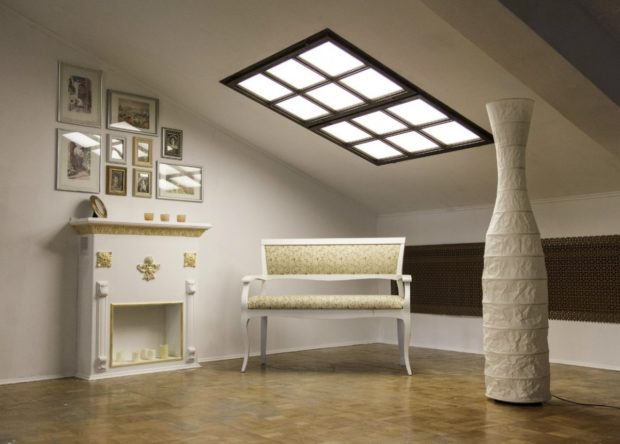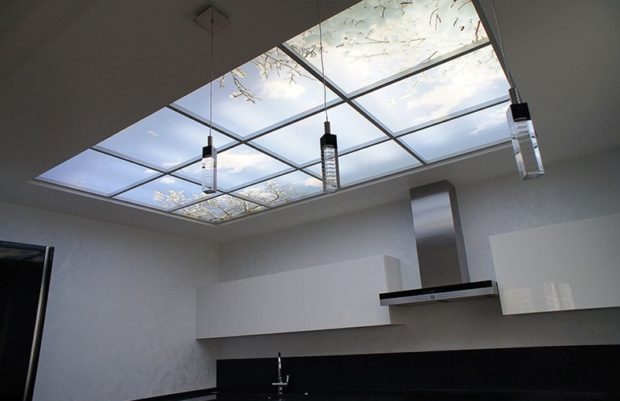 - au plafond, vous pouvez appliquer la même technologie que lors de l'aménagement d'une fausse fenêtre sur le mur. Dans l'évidement est créé contre-jouren répétant la température du jour, la structure se ferme verre dépoli ou verre à l'image du ciel, branches contre le ciel, etc. Certes, cette méthode nécessitera la construction d'une boîte de cloison sèche (technologie des faux plafonds), et cela prend quelques centimètres de hauteur, mais une source lumineuse volumétrique supplémentaire compense ces pertes.