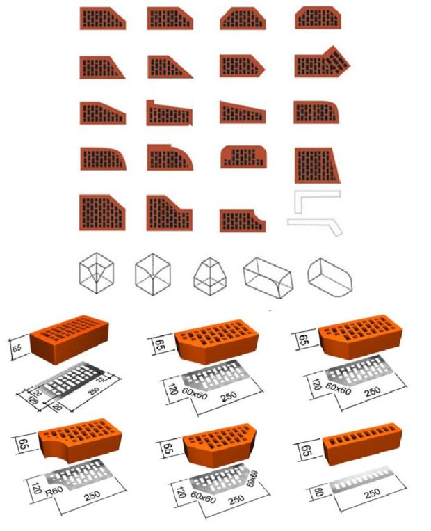 En bardage, une brique de forme irrégulière est souvent utilisée. Produits bouclés peut avoir une forme en forme de coin, triangulaire, arrondie et autre forme complexe. À l'aide de tels éléments, les ouvertures des fenêtres sont généralement décorées, appuis de fenêtre, coins de la maison et autres éléments architecturaux. La brique en forme vous permet de créer un apparence de la maison et maximisez votre imagination.