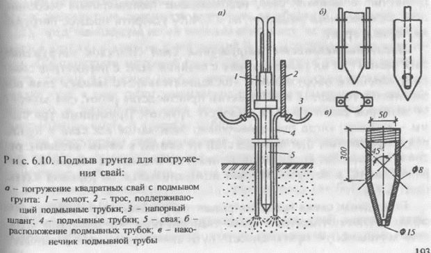 Des tubes sont construits dans la pointe ou les parois latérales de la pile, à travers lesquelles l'eau est fournie sous haute pression (environ 0,5 MPa). Sous l'influence de l'eau, le sol devient plus mou, souple, meuble et délavé. Ce principe nous est familier depuis le bac à sable. La résistance au sol du pieu est réduite, l'eau érode également les couches de sol adjacentes aux parois du pieu, ce qui réduit la force de friction. Les tubes d'alimentation en eau ont un diamètre de 38 à 62 mm. Le lavage latéral (pourvu de 2 ou 4 tubes sur les côtés de la pile, à 30-40 cm au-dessus de la pointe) réduit plus efficacement la force de friction des parois de la pile par rapport au lavage central (doté d'une pointe à jet unique ou à jets multiples au centre de la pile).