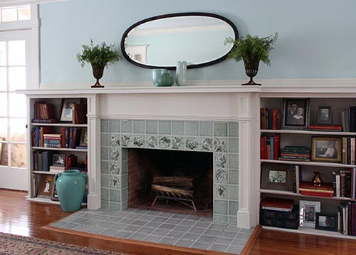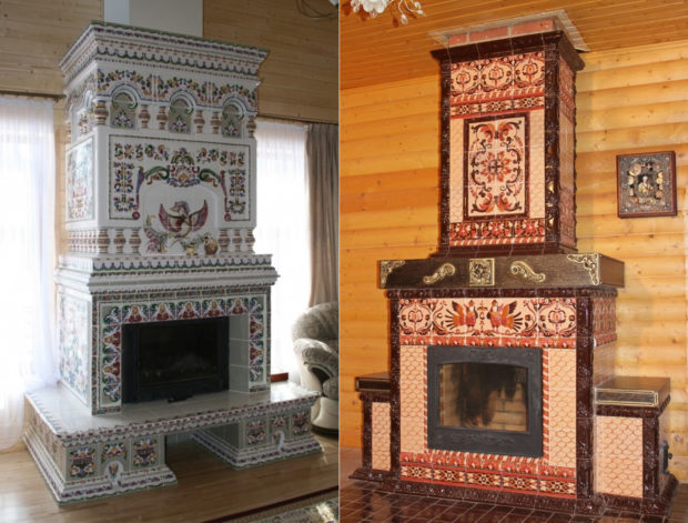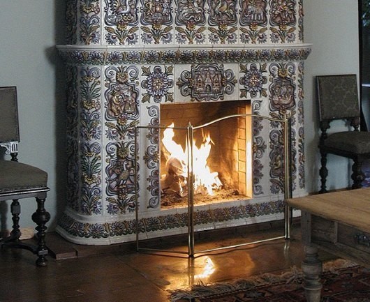 - majolique Il est également fabriqué à partir d'argile brûlée, mais il est recouvert de glaçure peinte sur le dessus, donc il coûte plus cher, mais il est également très beau. Lorsque vous décorez une cheminée avec de la majolique, vous devez considérer attentivement le croquis, car couper une telle tuile est non seulement impossible, mais très stupide. De plus, l'installation nécessite une compétence suffisante du maître, car les moindres défauts seront clairement visibles. En raison du coût élevé et des difficultés de notre travail, les cheminées finissent très rarement avec seulement de la majolique - elles l'utilisent généralement de manière fragmentaire, comme accent et décoration. Une telle solution est magnifique;