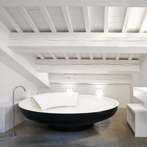 - bains ronds belles et élégantes, généralement installées non pas sous le mur, mais au centre de la pièce, elles nécessitent donc un espace suffisant et parfaitement laisser tomber les communications pas si simple. Les baignoires rondes offrent suffisamment d'espace pour un nageur qui se sentira comme dans une petite piscine. Ces produits dans les maisons privées sont souvent encastré dans le sol. Dans ce cas, l'esthétique est en place et même les problèmes d'isolation thermique et acoustique peuvent être résolus en utilisant une mousse de montage ou d'autres matériaux mentionnés ci-dessus;