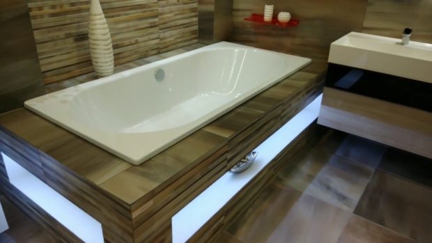 Si la salle de bain le permet, vous pouvez non seulement décider bain autoportantmais aussi le mettre le podium, - aura l'air très impressionnant. La touche finale est intéressante projecteur intégré au sol ou au podiumet vous ne voudrez pas quitter cette salle de bain.