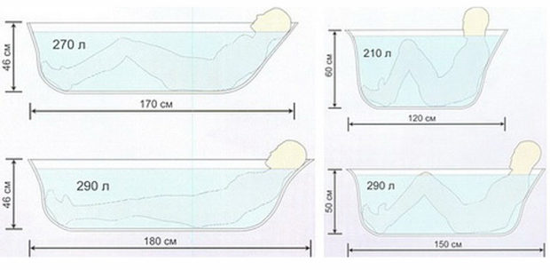 Quant à largeur, alors la plupart d'entre nous seront à l'aise bol 70-75 cm. Cela correspond à la largeur standard des baignoires. Il existe des produits encore plus larges - jusqu'à 90 et même 95 cm, et le même bain hexagonal en largeur atteint 100 cm.
