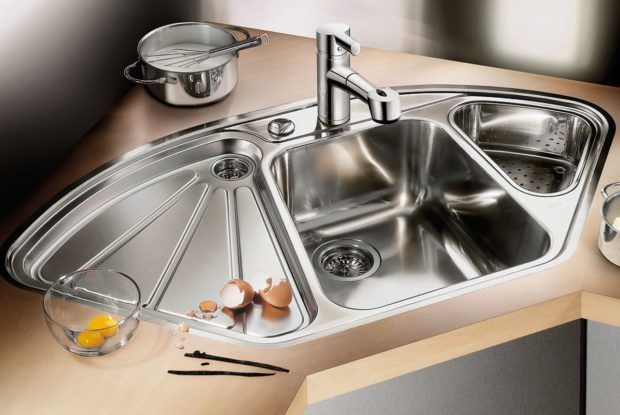 Grande option - évier d'angle. Cela vous permet d'utiliser efficacement l'espace de la cuisine, car nous savons tous que parfois il n'est pas facile d'équiper les coins. Souvent, les éviers d'angle sont complétés par des ailes des deux côtés pour sécher la vaisselle. Souvent, les produits similaires reçoivent également un bol supplémentaire.