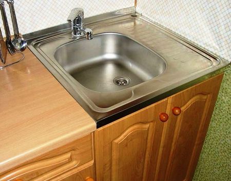 - lavage de surface - C'est déjà une version rétro. Un tel évier est monté au lieu d'un comptoir sur le dessus de l'un des modules de plancher de cuisine. L'installation est très simple. Auparavant, ce type d'installation était très populaire, aujourd'hui il est rarement utilisé. Il est utilisé principalement lorsque le budget est limité, ou qu'il est nécessaire de créer un intérieur rétro. Le point faible dans ce cas est les joints des bords de l'évier et des armoires adjacentes. Si de l'eau y pénètre, les meubles peuvent se détériorer, apparaître moule et une odeur désagréable, beaucoup préfèrent traiter le joint avec du scellant.