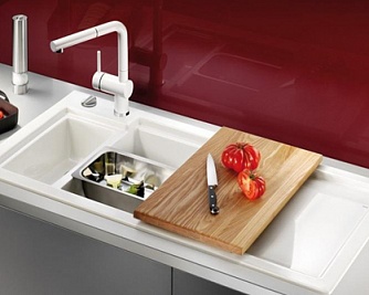 - planches à découper, dont la taille correspond exactement aux paramètres de l'évier. Grâce à ces planches, la zone de travail utilisable est augmentée et la découpe de viande et de poisson sera beaucoup plus pratique;