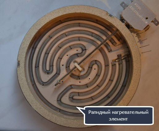 - brûleurs à éléments rapides équipé de spirales nichromes qui chauffent jusqu'à 10 secondes. Comme dans le cas d'un élément chauffant à ruban, un courant de démarrage élevé sera nécessaire, qui doit être pris en compte lors du choix disjoncteurs chaînes de plaques de cuisson;