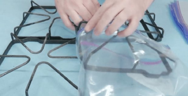 Les auteurs de nombreuses critiques sur Internet conviennent que c'est peut-être le moyen le plus efficace pour nettoyer le gril de la cuisinière à gaz. Il est nécessaire d'humidifier l'éponge avec de l'ammoniaque et de traiter centimètre par centimètre très soigneusement toutes les parties de la grille. Après cela, il doit être plié dans un sac en plastique et fermé hermétiquement, laissant pendant 3-4 heures ou même plus. Après cela, il est nécessaire de rincer la grille et de laver la saleté avec une éponge et un détergent - la suie et le tartre doivent littéralement s'éloigner de la surface métallique.