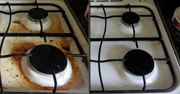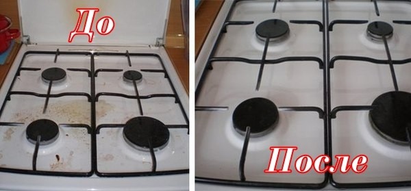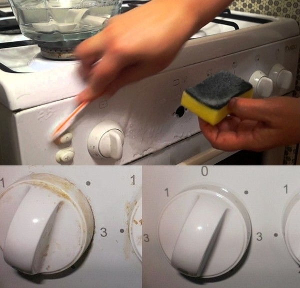 Et nulle part sans soda. Un peu d'eau y est ajoutée, obtenant une bouillie, qui est appliquée sur la brosse à dents. Maintenant, c'est une question de technologie: il est nécessaire de manipuler soigneusement toute la saleté sur les poignées et les brûleurs, puis de les essuyer avec une éponge humide ou un rinçage. La méthode convient aux poignées amovibles et non amovibles, juste dans ce dernier cas, ce sera un peu plus difficile.