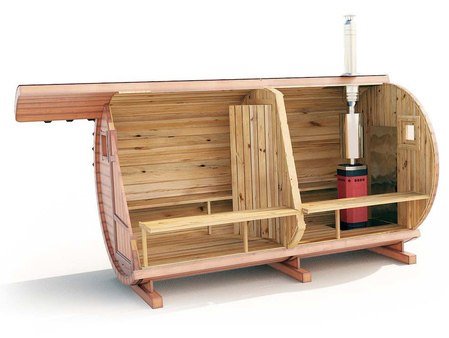 De plus, tout bain de barrique peut être équipé de petite terrasse couverte avec bancs pour se reposer à l'air frais, marches, petites tables, vantaux de fenêtres, protections pour le four et autres éléments. Basé sur le projet standard, il peut être en sous-effectif à votre goût, tout en recevant le bain de vos rêves.