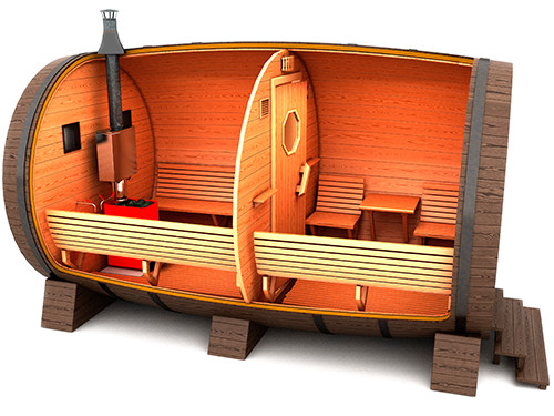 La caractéristique principale du baril de bain se comprend facilement à partir de son nom. Ceci est une conception qui a forme cylindrique: les extrémités rondes (rarement ovales) sont reliées par des planches et rapprochées par des cerceaux métalliques. Le diamètre et la longueur du canon peuvent varier considérablement, ce qui détermine la capacité du bain et le nombre de zones qui peuvent y être organisées. Le diamètre est généralement d'environ 2 à 2,5 m, la longueur varie de 2 à 6 m ou plus. Les portes dans un baril sont en bois ou en verre trempé. À l'extrémité opposée de l'entrée se trouve poêle. Les réservoirs sont généralement installés le long des murs.