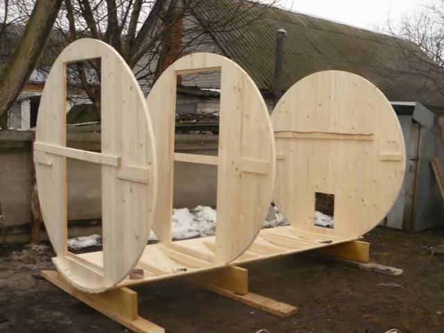 - fabrication de support de baril. Les supports sont constitués de planches bordées d'une épaisseur minimale de 5 mm. Ils sont montés par incréments de 150 cm, le nombre de supports dépend de la longueur du bain. Dans les supports, il est nécessaire de faire un décolleté arrondi, ce qui correspond au diamètre du canon. Il sera plus pratique de travailler avec un dessin pré-préparé. Les supports se fixent ensemble avec un attelage rigide;