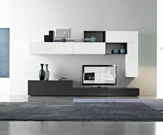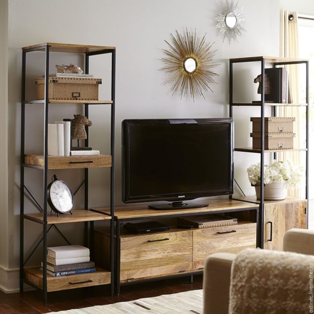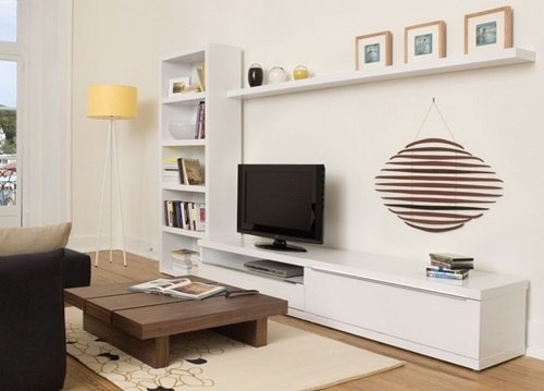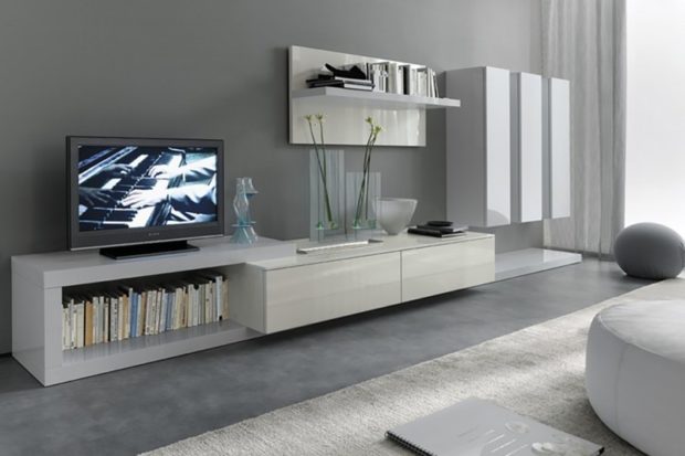 - armoire suspendue sous le téléviseur, il est fixé au mur et, en règle générale, est équipé de plusieurs étagères ouvertes ou fermées. Les dimensions varient considérablement.On pense que ces armoires ne sont pas perçues visuellement comme encombrantes comme leurs planchers, elles sont donc idéales pour les petites pièces. L'essentiel est de fixer solidement de tels meubles. L'installation se fait mieux sur le mur porteur - facile cloison en placoplâtre peut ne pas supporter une telle charge;