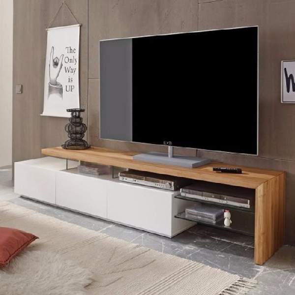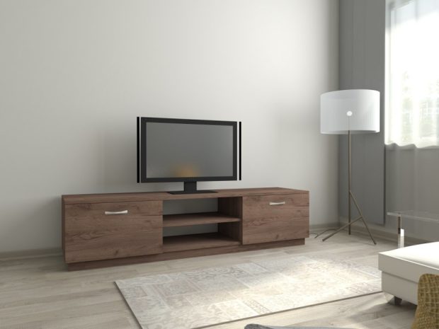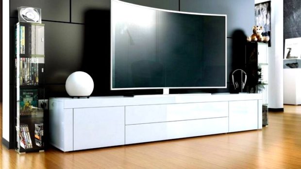 Il n'y a pas d'exigences strictes concernant les dimensions du meuble TV. L'essentiel est que le téléviseur ne le dépasse pas, c'est-à-dire le support doit être égal à la largeur du téléviseur ou être plus large que celui-ci. Voici comment la taille de la pièce le permet, et à votre guise. Si le meuble est beaucoup plus large que le téléviseur lui-même, il sera possible de placer beaucoup de choses nécessaires et tout simplement mignonnes dessus.