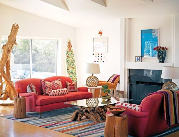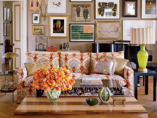 La principale chose dans le salon est un mobilier confortable et confortable. Vous ne pouvez pas vous passer d'un canapé avec un rembourrage coloré, ainsi que d'une montagne d'oreillers. Vous pouvez compléter le coin doux avec des fauteuils et poufs, un cadre avec un tapis lumineux et inhabituel une table basse. En tant que meuble d'armoire, vous pouvez utiliser des éléments vintage. N'oubliez pas les nappes, les couvre-lits, les rideaux et les rideaux, les objets rares, les objets de famille, vos propres collections, les souvenirs de voyage et les objets faits à la main. S'il n'y a pas de peintures écrites personnellement, vous pouvez décorer les murs avec vos toiles préférées, qu'il s'agisse d'une reproduction d'une peinture d'un artiste de la Renaissance ou d'une abstraction vivante.
