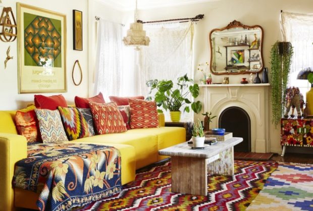 - boho chic - L'accent est mis sur les meubles chers en bois et en cuir, les tissus chers, les accessoires solides (livre de collection, tableaux classiques qui ont la valeur d'un vase et de figurines). L'émeute de couleurs transporte ici un grand nombre de couvre-lits et de tapis. Des miroirs et des peintures dans des cadres chics, une cheminée, un bouquet luxuriant de fleurs, des textures et des matériaux intéressants deviendront un ornement;