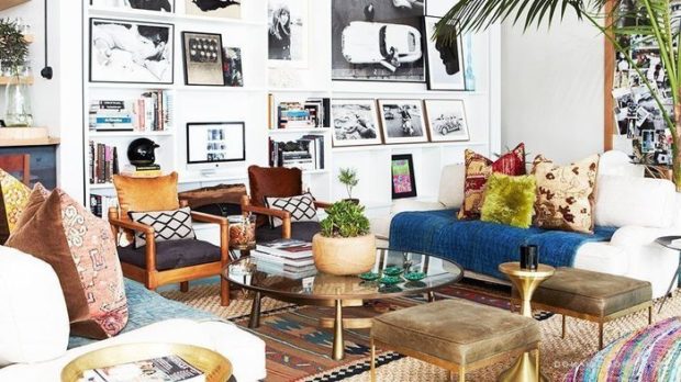 - boho glamour diffère dans le schéma général des couleurs claires, sur le fond duquel il y aura des perles lumineuses clairement visibles sur les lustres, les capes de fourrure, de nombreux oreillers, des gadgets vintage, des affiches étoiles et des peintures modernes.