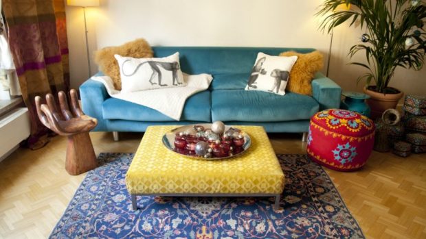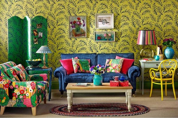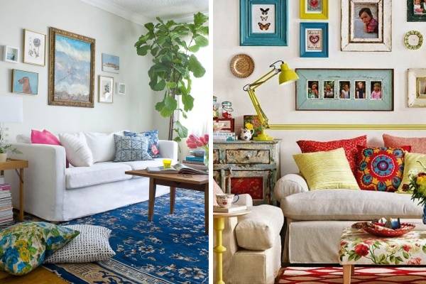 La principale chose dans le salon est un mobilier confortable et confortable. Vous ne pouvez pas vous passer d'un canapé avec un rembourrage coloré, ainsi que d'une montagne d'oreillers. Vous pouvez compléter le coin doux avec des fauteuils et poufs, un cadre avec un tapis lumineux et inhabituel une table basse. En tant que meuble d'armoire, vous pouvez utiliser des éléments vintage. N'oubliez pas les nappes, les couvre-lits, les rideaux et les rideaux, les objets rares, les objets de famille, vos propres collections, les souvenirs de voyage et les objets faits à la main. S'il n'y a pas de peintures écrites personnellement, vous pouvez décorer les murs avec vos toiles préférées, qu'il s'agisse d'une reproduction d'une peinture d'un artiste de la Renaissance ou d'une abstraction vivante.