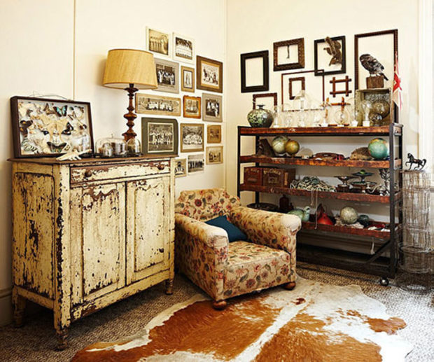 La devise du style est «combiner incongru». Les éléments traditionnels peuvent coexister tranquillement dans une pièce directions radicalement opposées. L'espace doit être surchargé de choses, comme si les souvenirs et les jolis bibelots au cœur ne sont pas censés être cachés - ils remplissent tous les murs, les étagères et les rebords de fenêtre. Les nuances importantes du style incluent également les nuances suivantes: