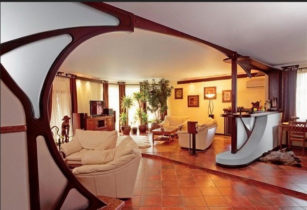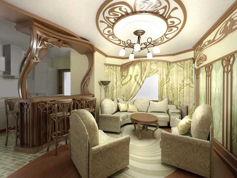 L'Art nouveau est plus facile à mettre en œuvre dans une grande pièce sans murs intérieurs. Vous pouvez vous-même le diviser en zones à l'aide de partitions aux lignes douces. Plafond haut sera un avantage.