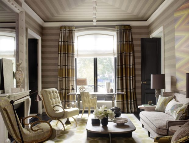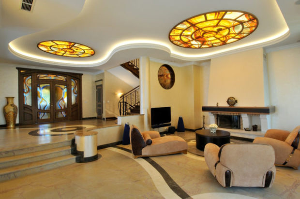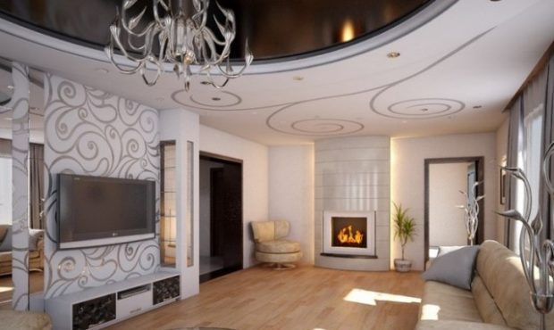 Murs du salon peindre dans une couleur neutre, vous pouvez utiliser plâtre décoratif ou papier peint liquide. Fit et papier peint en papier couleur calme ou avec un motif inexpressif. Le sol est fini avec du parquet, le plafond peut être à plusieurs niveaux, avec des éléments en vitrail ou un immense lustre.