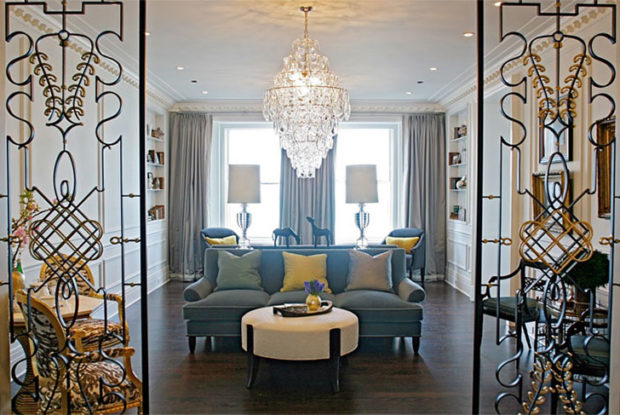 La décoration du salon sera de magnifiques lampadaires, appliques et lampes de table, tableaux et figurines, vases en verre et garde-corps forgés. Les rideaux et les oreillers peuvent être faits d'un seul ton. Si possible, vous pouvez organiser cheminée.