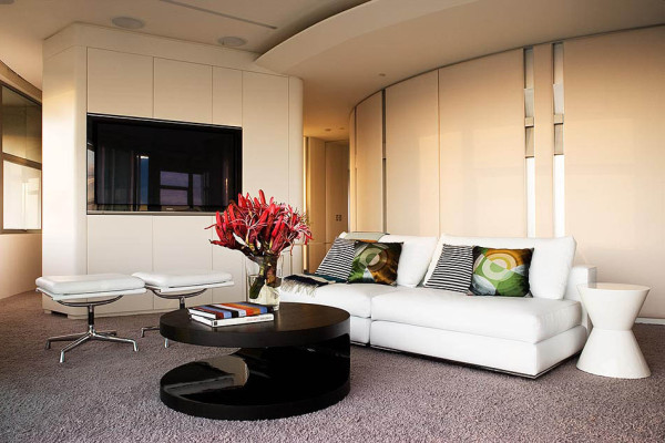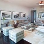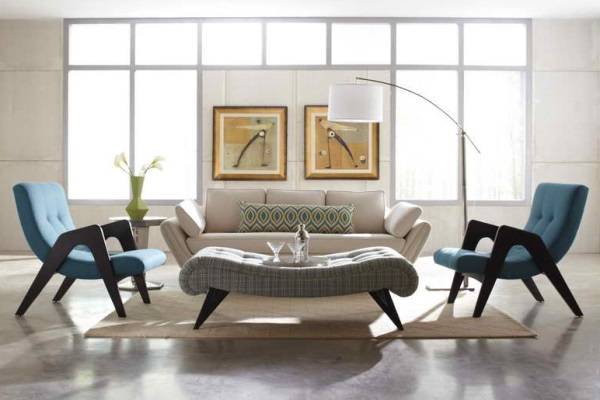 Le centre du salon est une zone douce. un canapé et plusieurs fauteuils. Le mobilier est présenté de manière asymétrique, souvent sous la forme de la lettre G. Le rembourrage des meubles rembourrés est principalement de la même couleur, la lumière. Tous les meubles en bois doivent être de la même race. Squat complémentaire de zone molle massif table basse sur des jambes fantaisies. Autorisé à utiliser moquette.