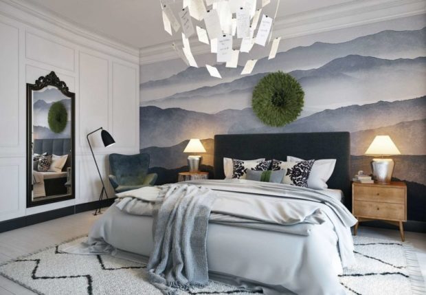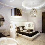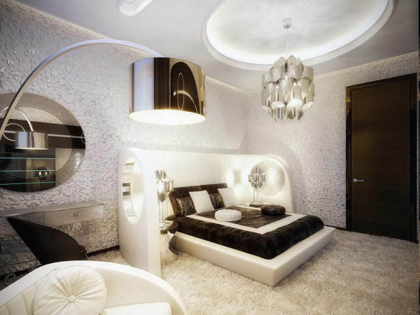Lit Vous pouvez le prendre avec une tête de lit en bois luxueuse, des tables côte à côte sont situées sur les pieds. Le cabinet doit être massif, et garde-robe avec portes vitrées. Tous les accessoires sont sélectionnés pour correspondre aux murs et au sol. Pour le mobilier et la décoration en utilisant le principe du minimalisme.
