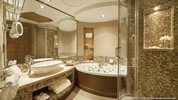 Une partie des murs de la salle de bain peut, selon la tradition, être peinte ou enduite. Les zones humides sont mieux recouvertes de carreaux de céramique ou mosaïque, et pour eux, les matériaux sont sélectionnés pour quelques nuances plus sombres que la couleur d'arrière-plan. Les planchers à motif orné s'intégreront à l'intérieur de la salle de bain. Les carreaux de céramique conviennent également, surtout si un bel ornement aux lignes douces et aux motifs floraux peut être formé d'éléments individuels.