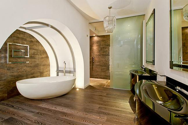 Les meubles sont mieux à utiliser à partir d'un seul ensemble. Idéalement, s'il aura la même teinte que le revêtement de sol. Des formes plus lisses et beaucoup de verre sont tenus en haute estime. Baignoire, évier et d'autres articles de plomberie dépourvus d'angles droits.