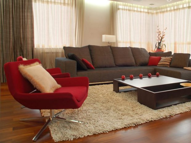 Dans la chambre près du lit, dans le salon dans la zone douce, il convient de poser moquette poil long, mais il doit être monophonique et correspondre au jeu de couleurs sélectionné.