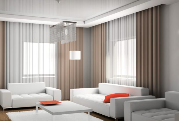 Si la hauteur du plafond le permet, vous pouvez créer une conception à plusieurs niveaux. Des plafonds tendus ou faux viennent à la rescousse. Le jeu de la couleur n'est pas utilisé - seulement le jeu de la lumière et de l'ombre.
