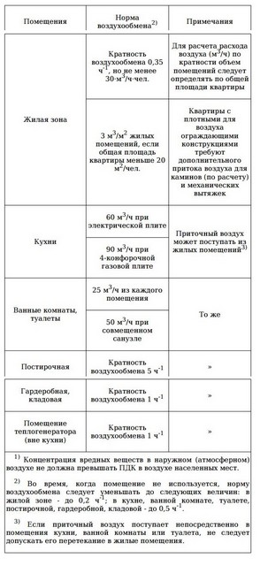 Selon SNiP 31-02-2001, l'échange d'air pour les locaux d'habitation est égal au volume de la pièce, c'est-à-dire en 1 heure, l'air doit être complètement renouvelé 1 fois. Pour la cuisine, ce chiffre est d'au moins 60 m3 / heure, pour la salle de bain - 25 m3 / heure. Le volume de la pièce est facile à calculer.