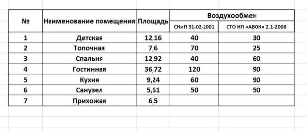 Vous devez d'abord trouver la quantité d'air, qui doit entrer dans la maison et en être retiré en une heure. En théorie, le volume d'air entrant = le volume de l'air extrait. Quelle quantité d'air doit entrer et sortir pour nous mettre à l'aise? Dans les documents normatifs, tout est déjà compté.