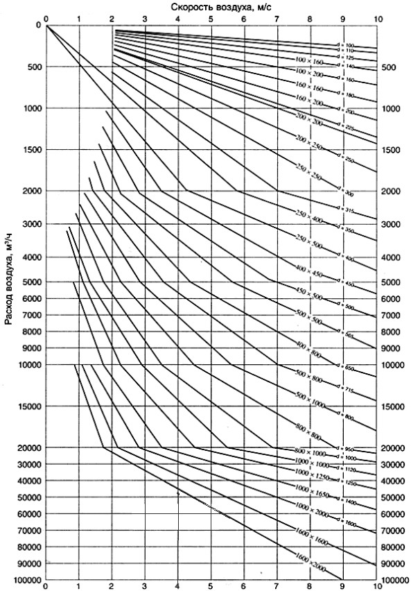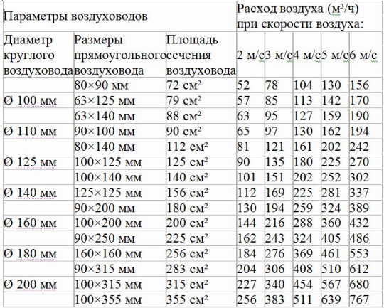 De plus, lors du calcul, il est nécessaire de considérer comment l'air sera-t-il évacué, naturellement ou avec force. Dans la méthode naturelle, la vitesse du flux d'air à l'intérieur du conduit ne sera pas supérieure à 1 m / s, avec une force - jusqu'à 5 m / s, dans les branches - jusqu'à 3 m / s.