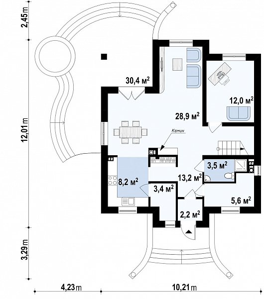 Ce projet peut être appelé solution universelle. La maison peut être utilisée comme résidence permanente et temporaire. Il aura besoin d'un peu d'espace sur le site, mais tout est prévu à l'intérieur afin qu'une grande famille ou entreprise puisse facilement être logée. Surface totale - 120 m2. Au rez-de-chaussée, selon le projet, il y a un immense salon lumineux (les fenêtres sont situées sur trois côtés), passant dans la salle à manger et la cuisine. Parmi les caractéristiques on note la présence de baie vitrée et cheminée, il sera donc confortable de dîner et de passer des soirées ici à tout moment de l'année. Près du salon il y a une place pour armoire, qui, si vous le souhaitez, peut être transformée en chambre ou en chambre d'enfant. Aussi au rez-de-chaussée il y a petit garde-manger à côté de la cuisine, de la salle de bain et du couloir, dans lequel il y a suffisamment d'espace pour l'emplacement garde-robe.