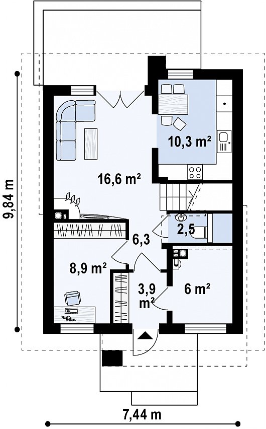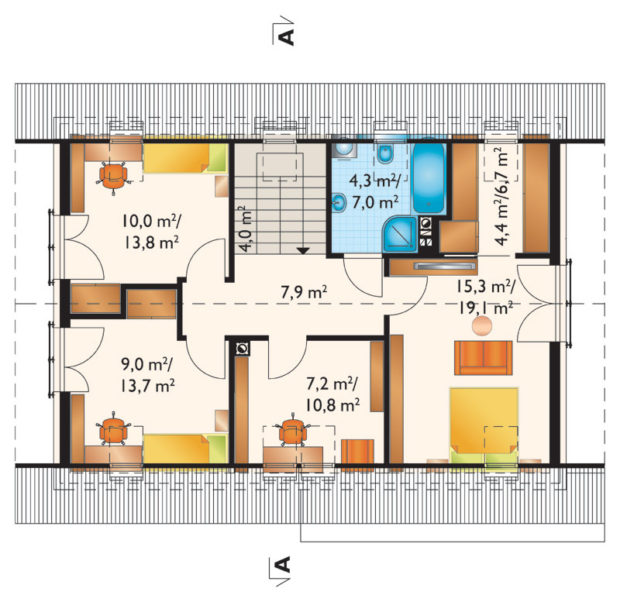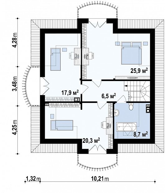 Le grenier est un quartier entièrement résidentiel avec trois chambres et une grande salle de bains. Deux chambres ont accès à un balcon commun, et la salle de bain a une buanderie séparée. Caractéristiques de la maison architecture classiquetoiture simple et la présence d'une terrasse, qui offre un accès direct depuis le salon. La façade peut être réalisée en utilisant du plâtre et pierrecomme indiqué dans les images, mais d'autres matériaux peuvent être sélectionnés. Réfléchi, compact, parfait!