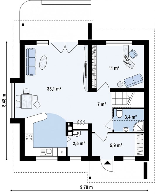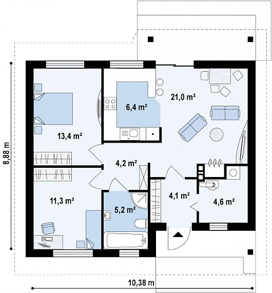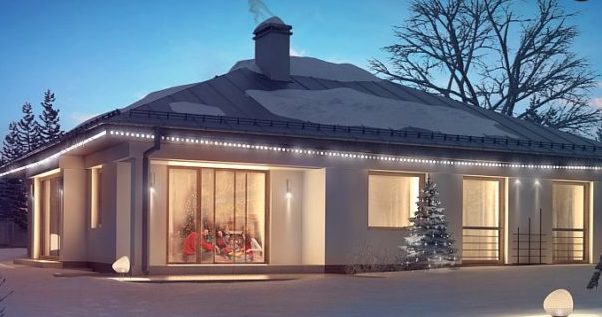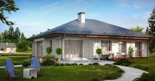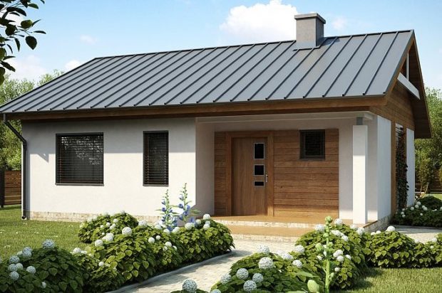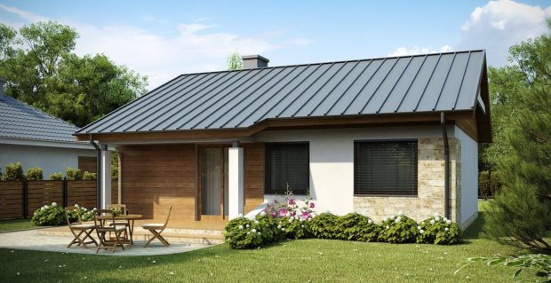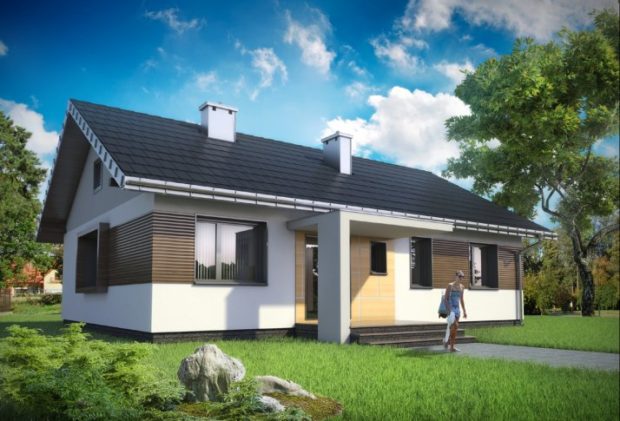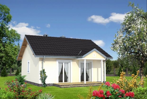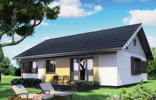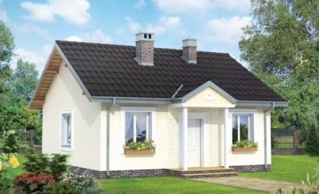 La superficie de la maison est la même que la plupart des appartements de deux chambres modernes - 53,5 m2. Les concepteurs ont réussi à organiser correctement toutes les pièces de la maison, de sorte qu'elles tiennent dans un si petit espace deux petites chambres séparées, salle de bain et cuisine-salon. La maison, malgré sa taille compacte, est très intéressante. Nous parlons non seulement de la cheminée et du salon spacieux, mais aussi de la terrasse. Vous pouvez y accéder depuis le salon et la chambre. Une solution très intéressante et pratique! Une maison construite sur un tel projet convient à une famille avec un ou deux enfants et sera également une excellente option pour des vacances d'été à la campagne.