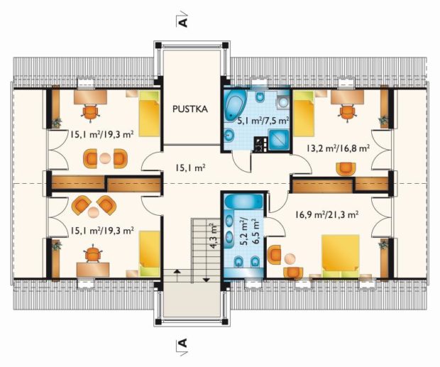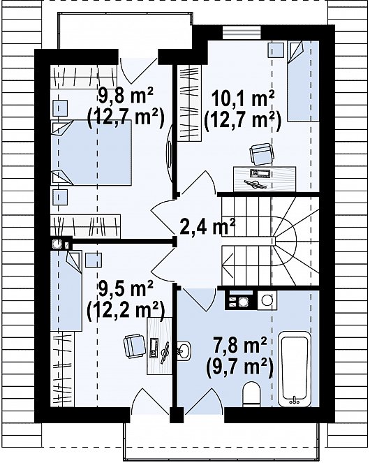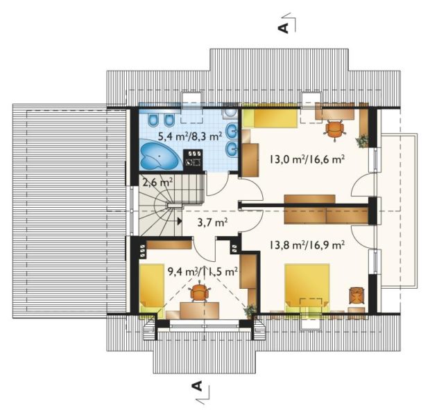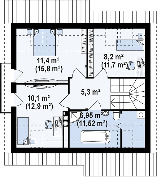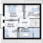 Au deuxième étage, vous pouvez placer trois chambres, ou deux chambres et un bureau - comme vous le souhaitez. Deux chambres ont accès à un balcon commun. Naturellement, le deuxième étage a sa propre salle de bain. Une excellente option pour la résidence permanente et pour la construction d'une maison de campagne pour le reste. Surface totale 141 m2.