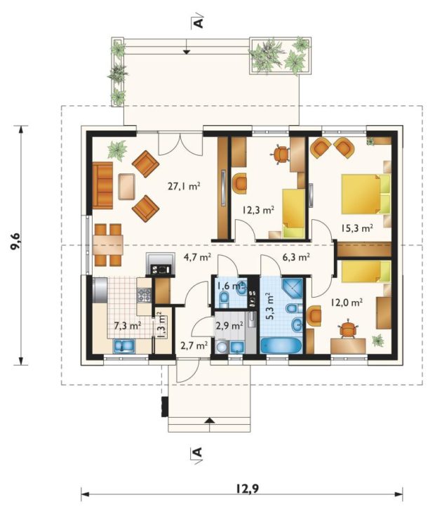 Le projet implique la construction maison de plain-pied avec trois chambres, séjour, cuisine et local technique. La disposition se compare favorablement à deux salles de bainplus précisément la salle de toilette et la salle de bain. La superficie de ce dernier est suffisante pour y accueillir non seulement baignoires ou cabine de douche, mais aussi des lavabos avec toilettes, donc vous pouvez éviter les files d'attente dans les toilettes, et quand il y a trois chambres dans la maison, c'est important.