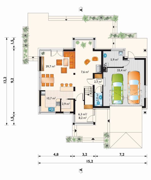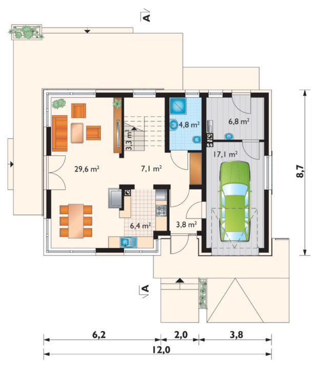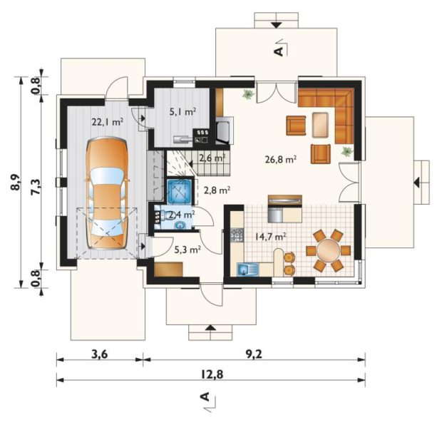 Le salon coule en douceur dans la salle à manger et la cuisine. Le projet prévoit une cheminée que vous pourrez apprécier assis sur le canapé ou à la table à manger. Près de la cuisine il y a un endroit à placer garde-manger, depuis le salon il y a un accès à la terrasse. Idéal pour les familles avec plusieurs enfants. Surface totale 98 m2.