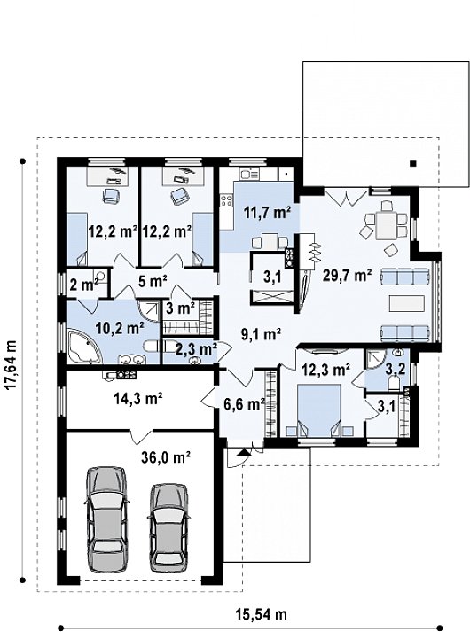 Ce projet est conçu pour les fans de maisons à un étage qui souhaitent obtenir un espace de vie assez spacieux qui répond aux exigences les plus élevées. Le projet fournit grand garage double. Le garage à travers le local technique est relié à la maison - tout est pensé. Le cœur de la maison sera salon avec d'immenses baies vitrées et cheminée. Passer des soirées ici sera un plaisir. Le coin cuisine est commodément séparé de la salle à manger et du salon. Idéalement, il y a un garde-manger à proximité.