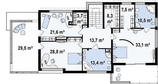La maison a trois chambres à coucher. L'un d'eux a reçu sa propre salle de bain et dressing, les deux autres sont situés à proximité immédiate avec une salle de bain, salle de bain et dressing communs. Au fait, la salle de bain commune est très grande, elle a alloué séparément une pièce pour laver les vêtements. Depuis le salon, comme vous pouvez le deviner, il y a un accès à la rue. Une telle maison peut être considérée comme une solution idéale pour la résidence permanente d'une grande famille. Surface totale 176 m2.