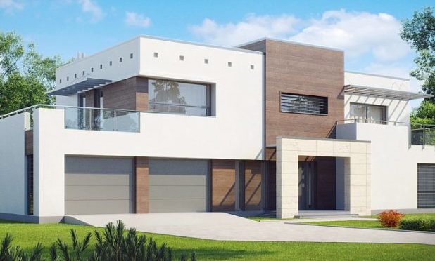 Si le style classique ne vous convient pas et que vous voulez quelque chose de très moderne et inhabituel, alors vous devriez aimer ce projet. La maison est conçue pour une grande famille ou une entreprise décente. La moitié du premier étage est garage double, de là, vous pouvez entrer dans la maison, en passant par le local technique. La seconde moitié du premier étage - un immense salon (45 m2) avec cheminée et accès à la terrasse. Le salon est combiné avec un coin repas et une cuisine. La caractéristique de conception est une grande surface vitrée du salon et sortie supplémentaire sur la terrasse. La deuxième porte est située à proximité immédiate de la cuisine, pour permettre aux propriétaires d'organiser facilement des repas en plein air. Au rez-de-chaussée, il y a également un garde-manger pour ranger les ustensiles et fournitures de cuisine, un petit dressing, une salle de bains et un bureau.